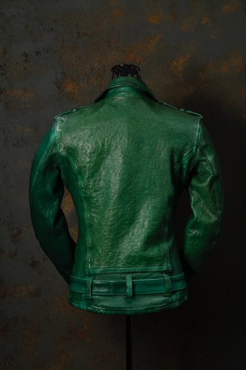 PRODUCT AUTUMN WINTER 2018 JAPAN CALF “GARMENT-DYED” DOUBLE RIDERS No : 1498_03_GRN Material : Rightside / Japanese Calf (牛革) Lining / 100% Polyester Color : Green Size : S / M / L / XL Price : ¥180,000 (Plus Tax) ONLINE STORE