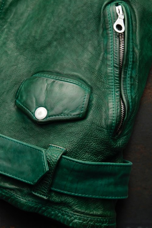 PRODUCT SPRING SUMMER 2019 JAPAN CALF “GARMENT-DYED” DOUBLE RIDERS No : 1498_03_GRN Material : Rightside / Japanese Calf (牛革) Lining / 100% Polyester Color : Green Size : S / M / L Price : ¥180,000 (Plus Tax) ONLINE STORE