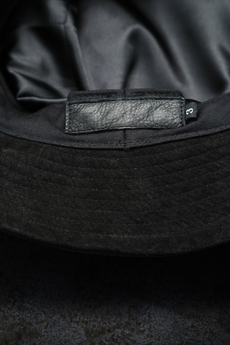 PRODUCT AUTUMN WINTER 2022 KANGAROO SUEDE BUCKET HAT No : 819_02_BLK Material : Rightside / Kangaroo Suede Leather (カンガルー革) Color : Black Size : M / L Price : ¥25,000 (Plus Tax) ONLINE STORE