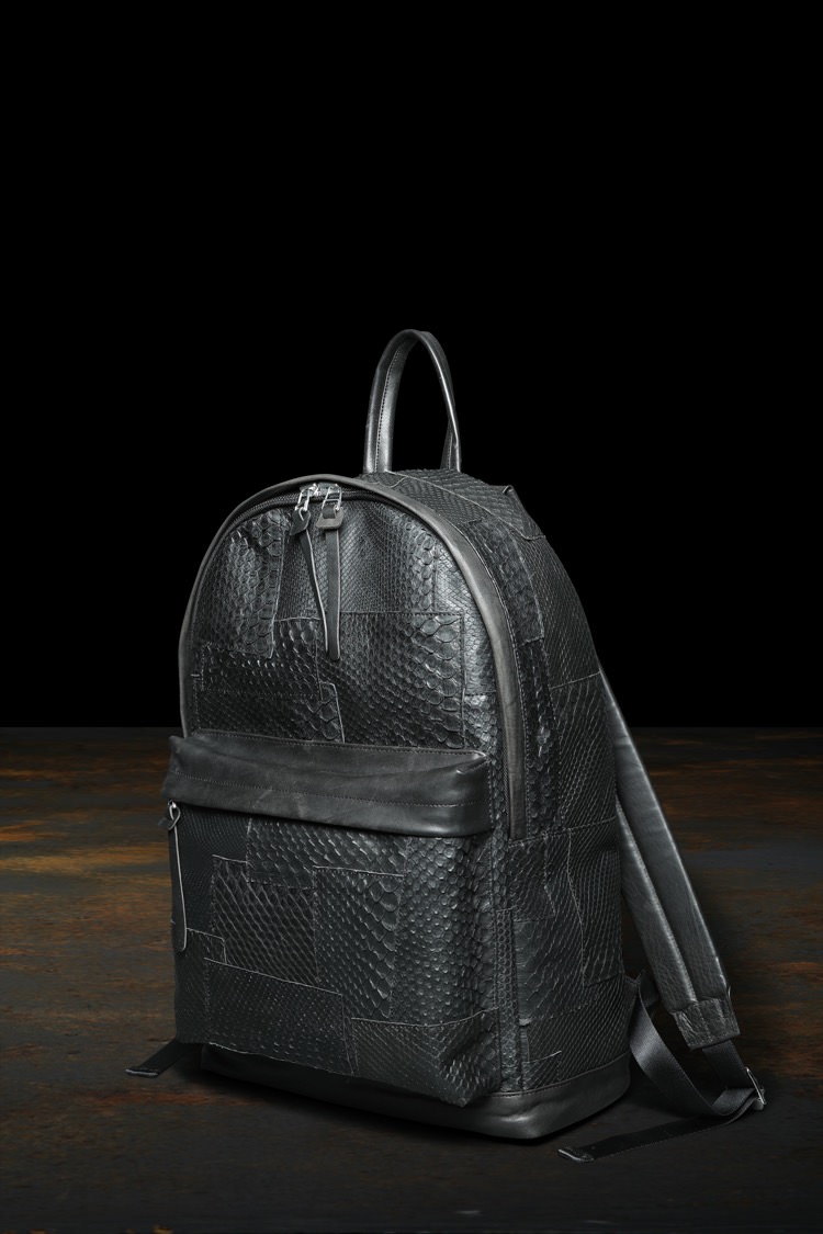 PRODUCT AUTUMN WINTER 2022 PYTHON + GUIDI CORDOVAN PATCHWORK BACK PACK No : RE1612_85_BLK Material : Rightside / Python Leather (蛇革) , Guidi Cordovan (馬革) Color : Black Size : F Price : ¥250,000 (Plus Tax) ONLINE STORE