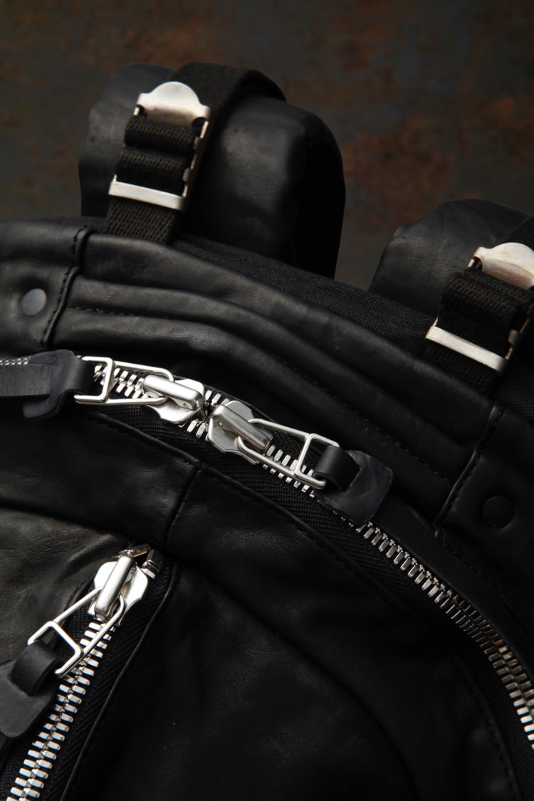 PRODUCT AUTUMN WINTER 2023 ITALY SHOULDER GARMENT-DYED BACKPACK No : 243_03_BLK Material : Rightside / Italy Shoulder Leather (牛革) Color : Black Size : F Price : ¥105,000 (Plus Tax) ONLINE STORE