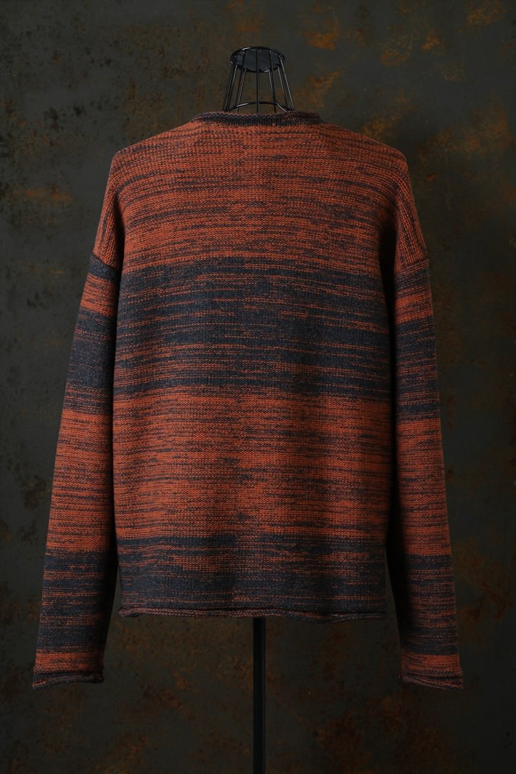 PRODUCT AUTUMN WINTER 2023 HORIZON WOOL KNIT PULLOVER No : KN_776_01_ORGM Material : Rightside / 100% Wool Color : Orange.Mix Size : S / M / L Price : ¥49,000 (Plus Tax) ONLINE STORE
