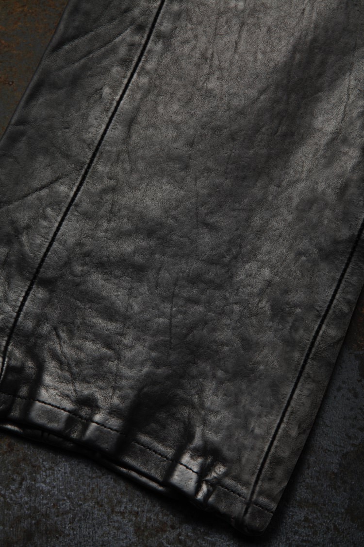 PRODUCT SPRING SUMMER 2023 ITALY SHOULDER “GARMENT-DYED” PANTS No : 1254_08_BLK Material : Rightside / Italy Double Shoulder Leather (牛革) Color : Black Size : XS / S / M / L / XL Price : ¥190,000 (Plus Tax) ONLINE STORE