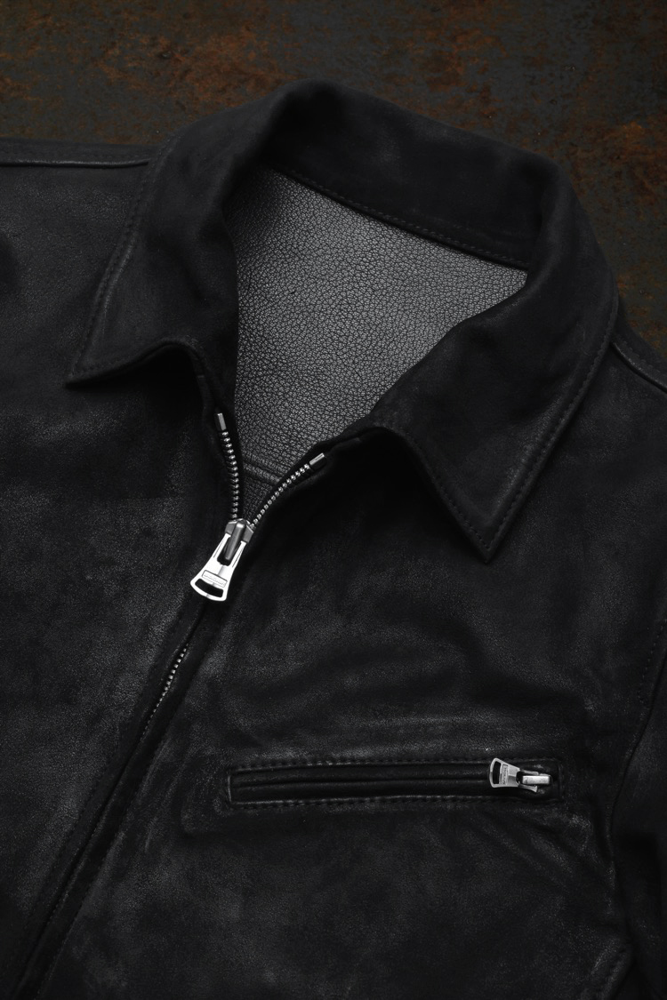 PRODUCT SPRING SUMMER 2024 INDIAN GOAT SUEDE “GRADATION NAPPALAN-FINISH” SINGLE COLLAR RIDERS No : 2097_02_BLK Material : Rightside / Indian Goat Leather (山羊革) Color : Black Size : M / L / XL Price : ¥170,000 (Plus Tax) ONLINE STORE