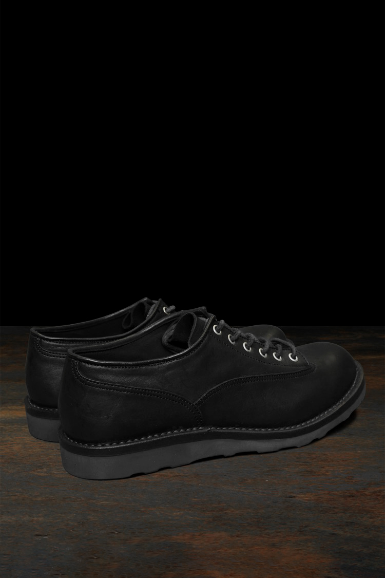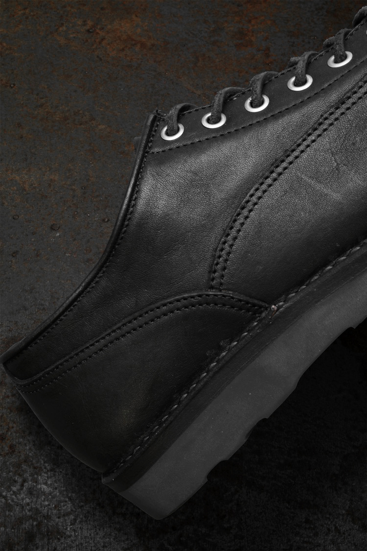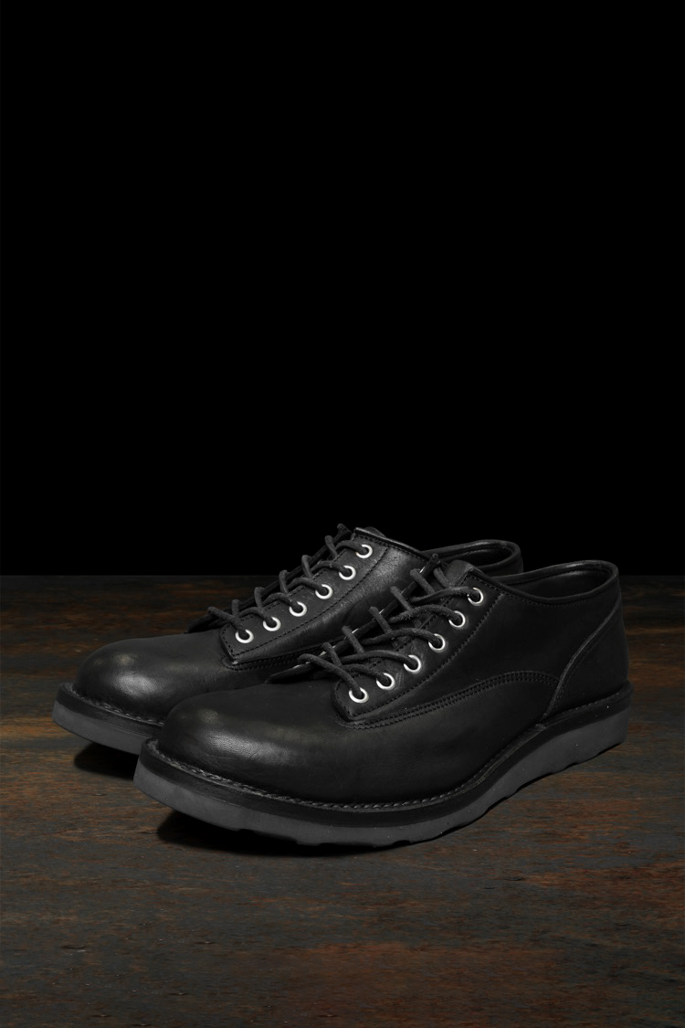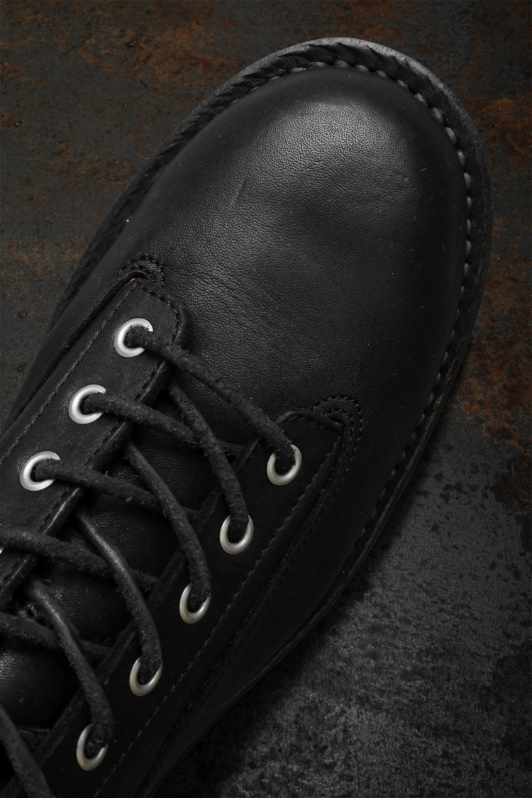 PRODUCT SPRING SUMMER 2026 JAPAN SHOULDER “GARMENT-DYED” LACE-UP LOW BOOTS / WEDGE SOLE No : 661_02 Material : Rightside / Japan Double Shoulder Leather (牛革) Color : Black Size : 25 / 26 / 27 Price : ¥110,000 (Plus Tax) ONLINE STORE