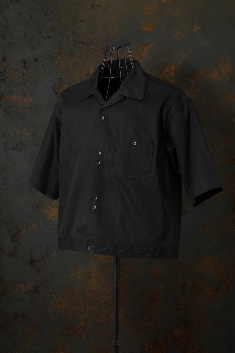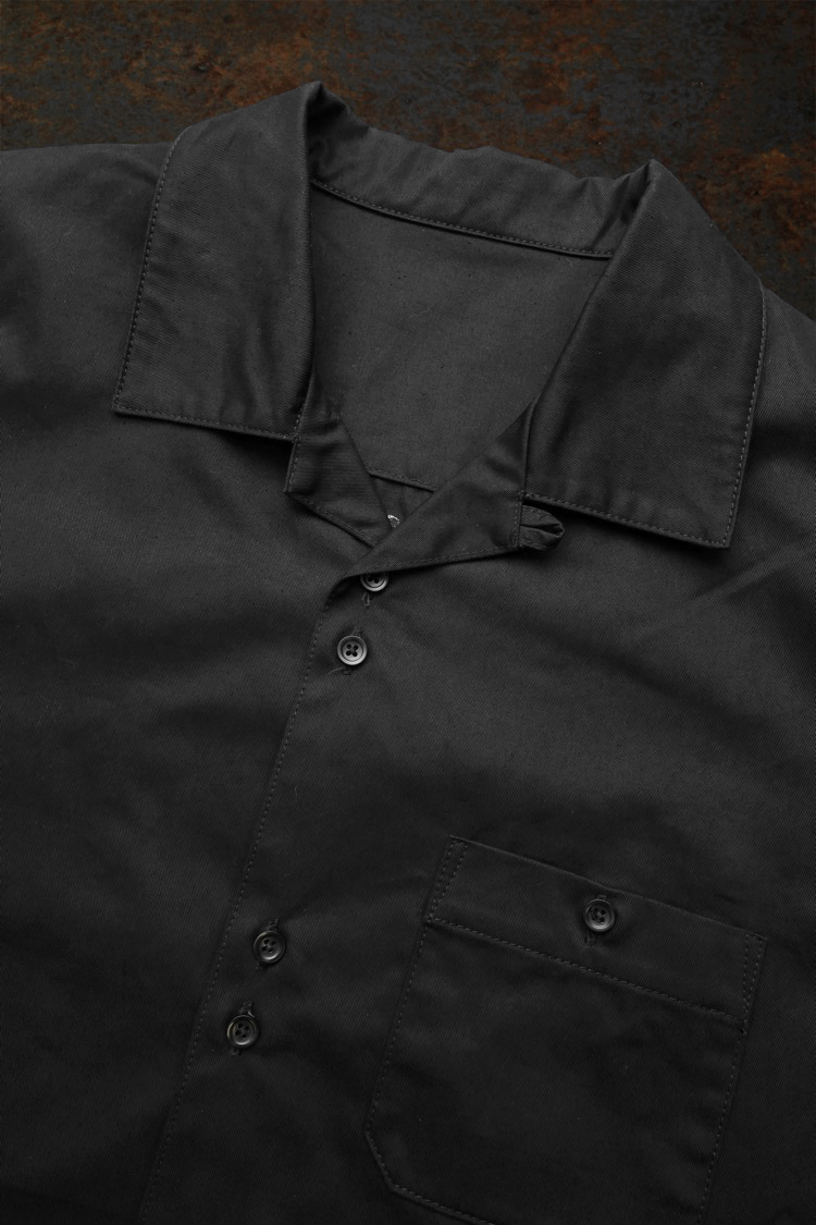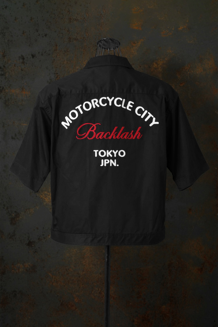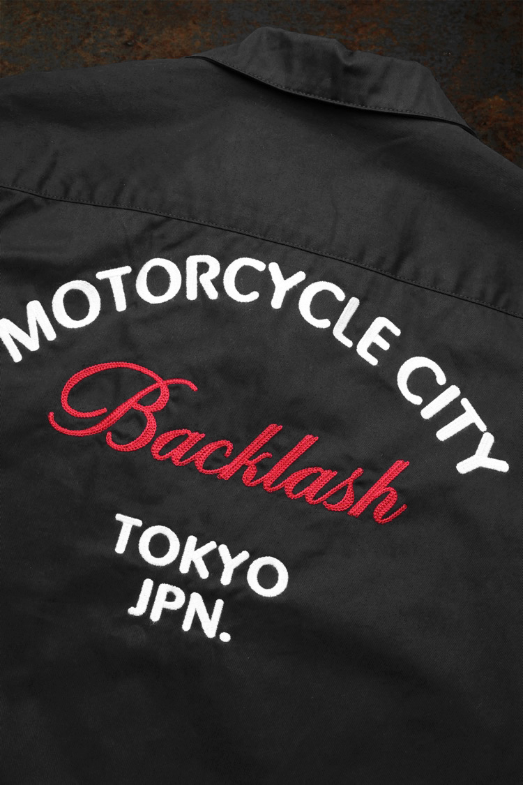 PRODUCT SPRING SUMMER 2026 HIGH DENSITY CHINO OPEN COLLAR SHIRT H/S “BACKLASH TYO JPN. EMB” No : 2197_01_BLK Material : Rightside / 100% Cotton Color : Black Size : M / L Price : ¥42,000 (Plus Tax) ONLINE STORE