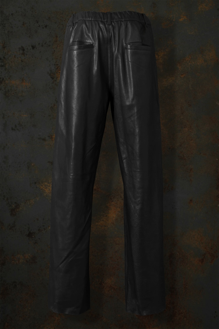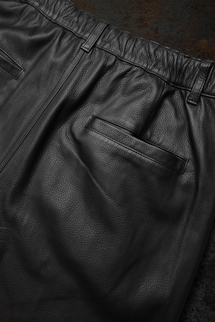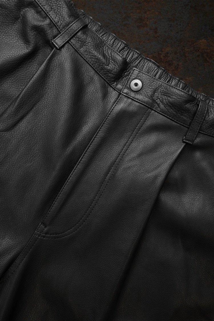 PRODUCT SPRING SUMMER 2026 JAPAN STEER SHRINK WIDE STRAIGHT EASY PANTS No : 2191_01 Material : Rightside / Japan Steer Leather (牛革) Color : Black Size : S / M / L Price : ¥170,000 (Plus Tax) ONLINE STORE