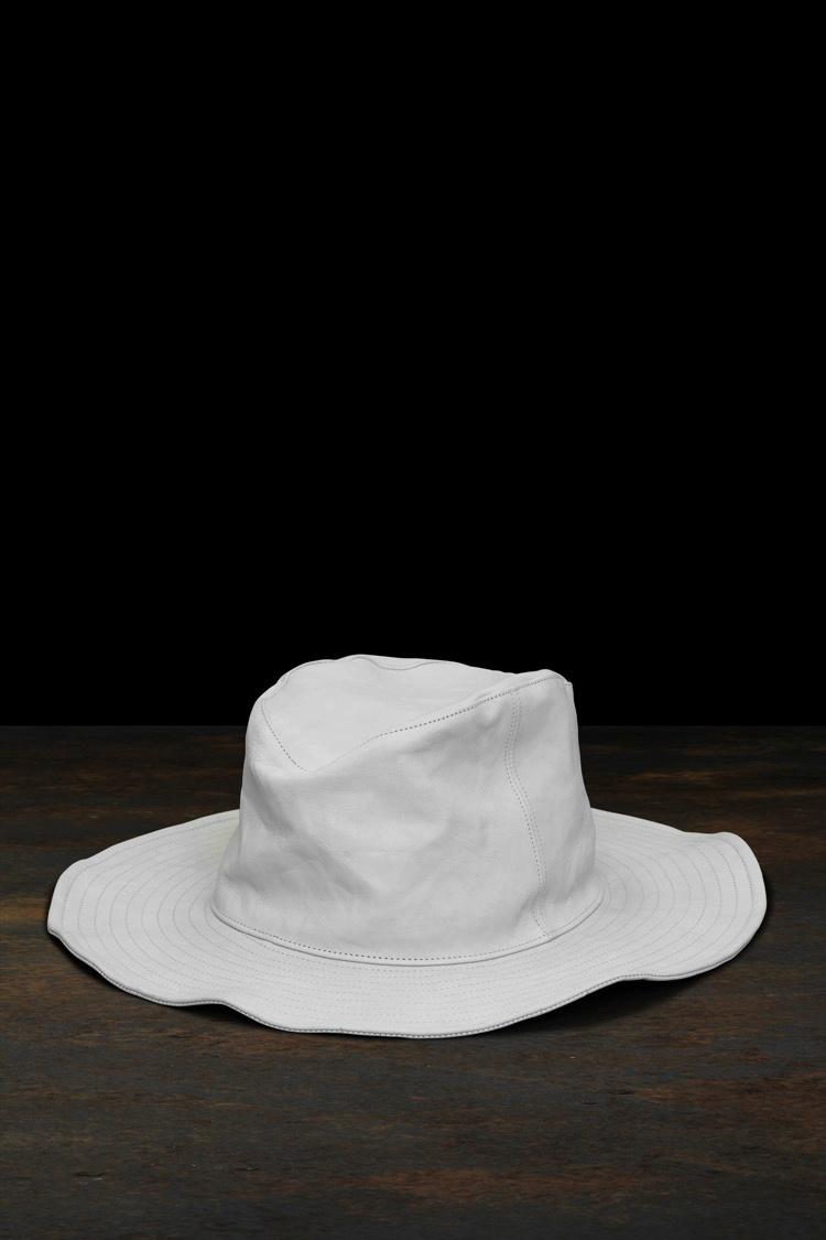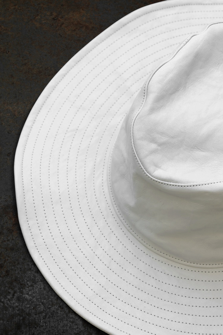 PRODUCT XX Yohji Yamamoto XX Yohji Yamamoto JAPAN CALF TENGALLON HAT No : HP_H14_778 Material : Rightside / Japan Calf Leather (牛革) Lining / 100% Cotton Color : White Size : F Price : ¥62,000 (Plus Tax) ONLINE STORE